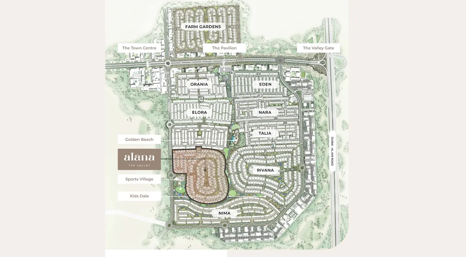 Alana is located within The Valley master community in Dubailand, directly on Dubai–Al Ain Road, offering quick access to Dubai Outlet Mall, Downtown Dubai, and Dubai International Airport.