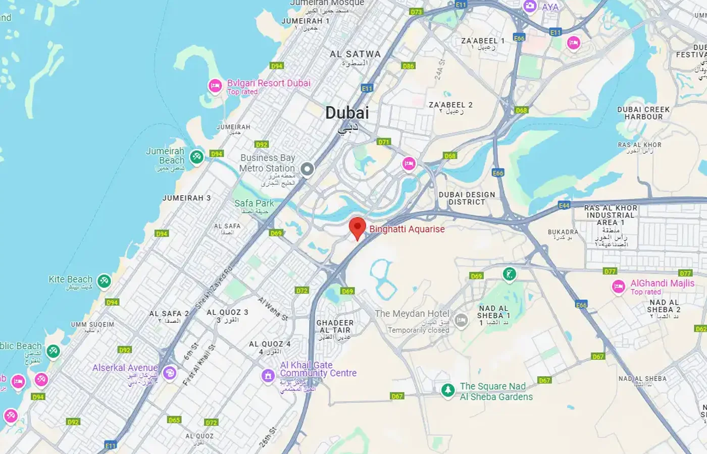 Binghatti Aquarise is located in Business Bay, Dubai, close to Downtown Dubai, Sheikh Zayed Road, Dubai Mall, and major business districts, making it ideal for urban living and investment.