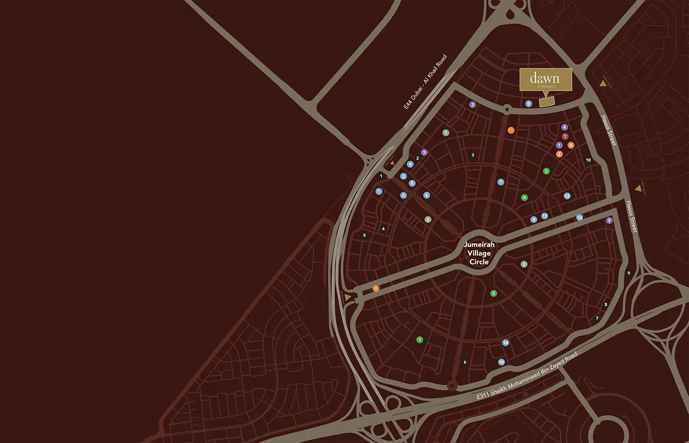 Dawn by Binghatti is located in Jumeirah Village Circle, offering easy access to Sheikh Zayed Road, Dubai Marina, Downtown Dubai, and key business and leisure hubs.
