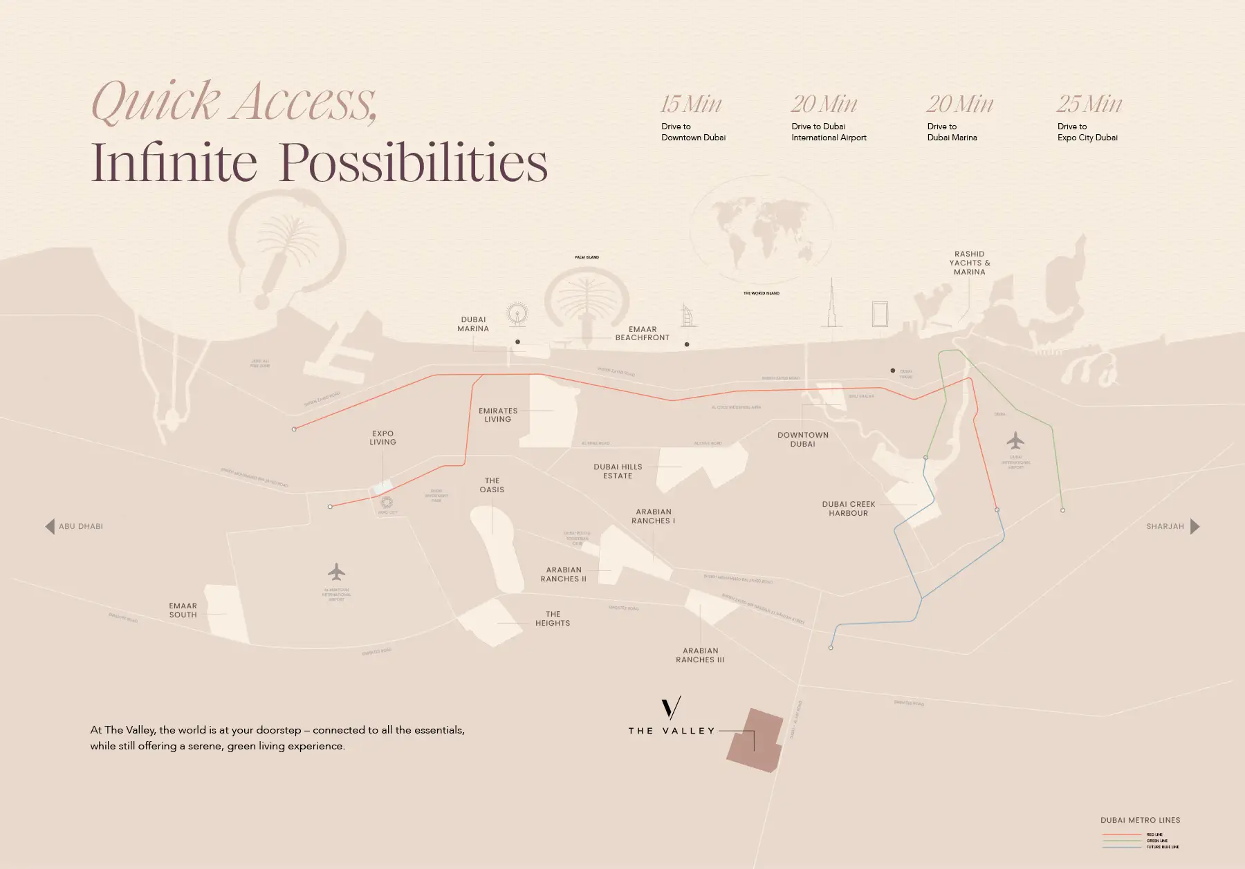 Elva is located in The Valley, offering easy access to major highways and Dubai’s key areas, ensuring convenient travel and smooth daily commutes.