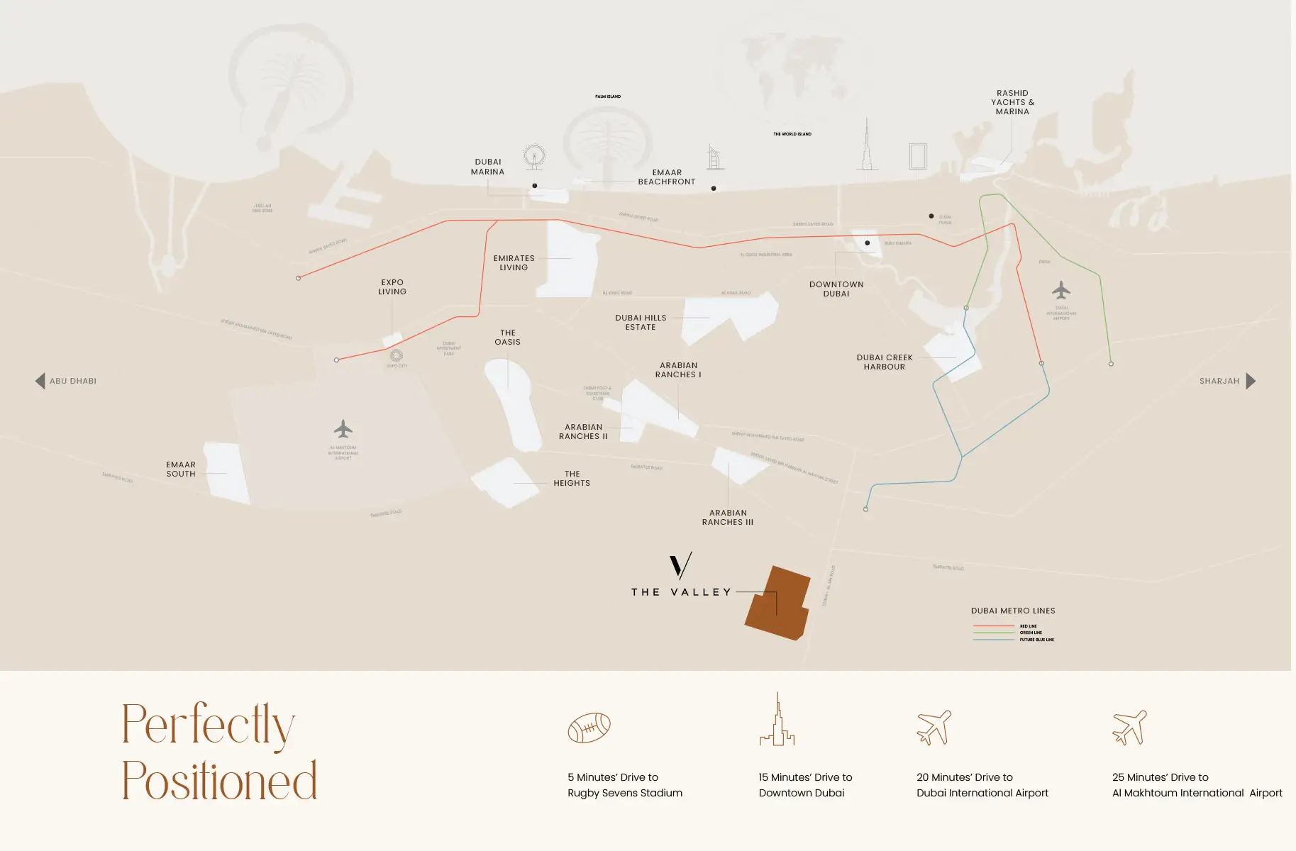 Farm Grove is located in The Valley, Dubai, a well-planned residential community offering serene surroundings, modern amenities, and excellent connectivity to major landmarks of the city.