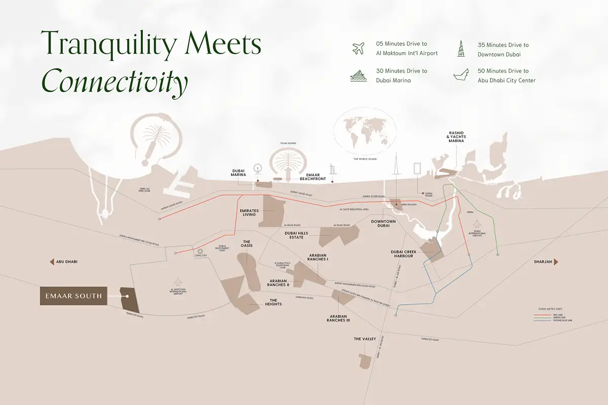 Golf Dale is perfectly positioned within the prestigious Emaar South community, close to Al Maktoum International Airport and Expo City Dubai. This strategic location offers unparalleled connectivity to key transport corridors, business hubs, and entertainment districts.
