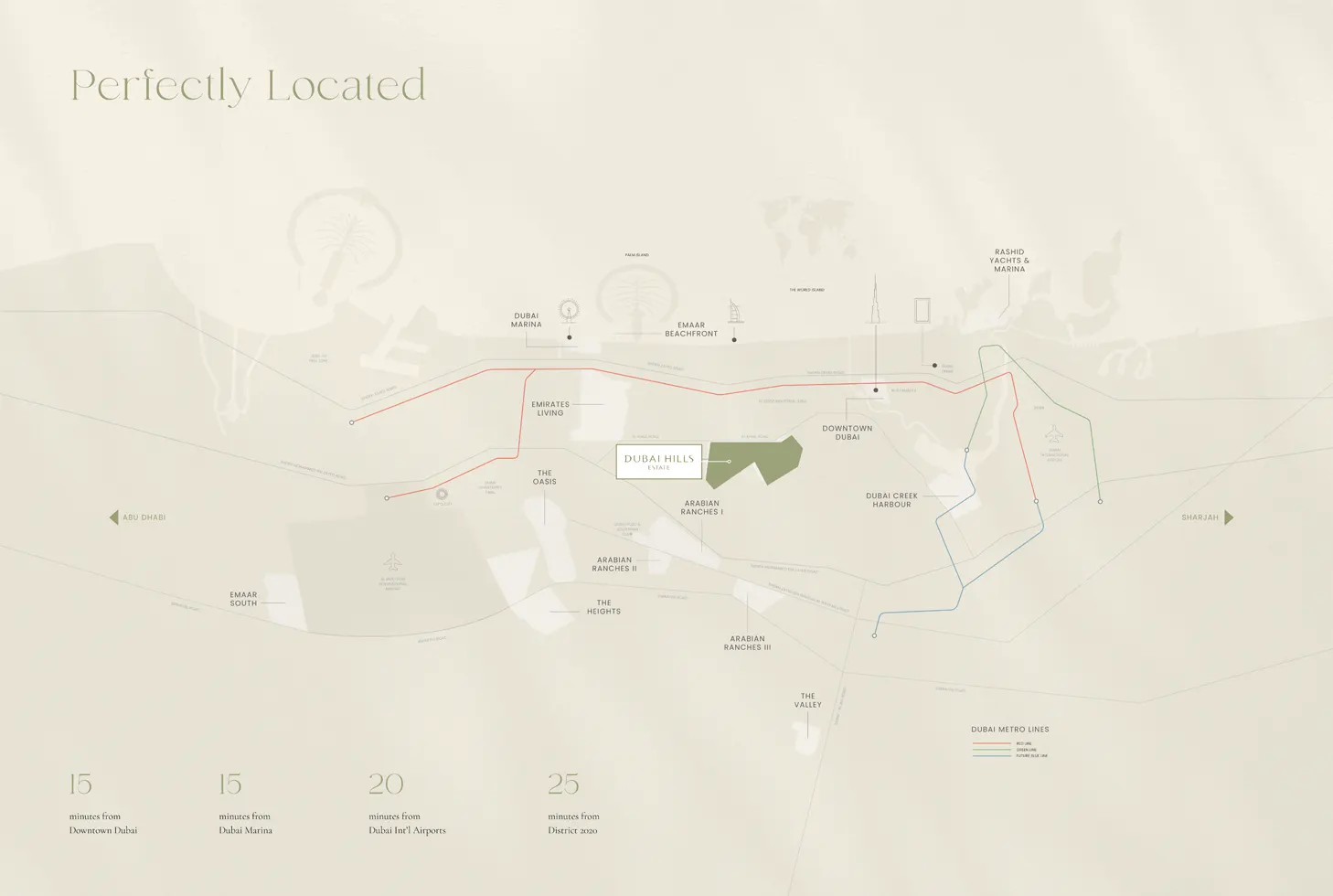 Parkland enjoys a central position within Dubai Hills Estate, a premium master-planned community by Emaar, offering scenic surroundings, green parks, and a blend of urban convenience with natural tranquility.