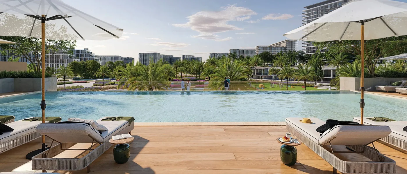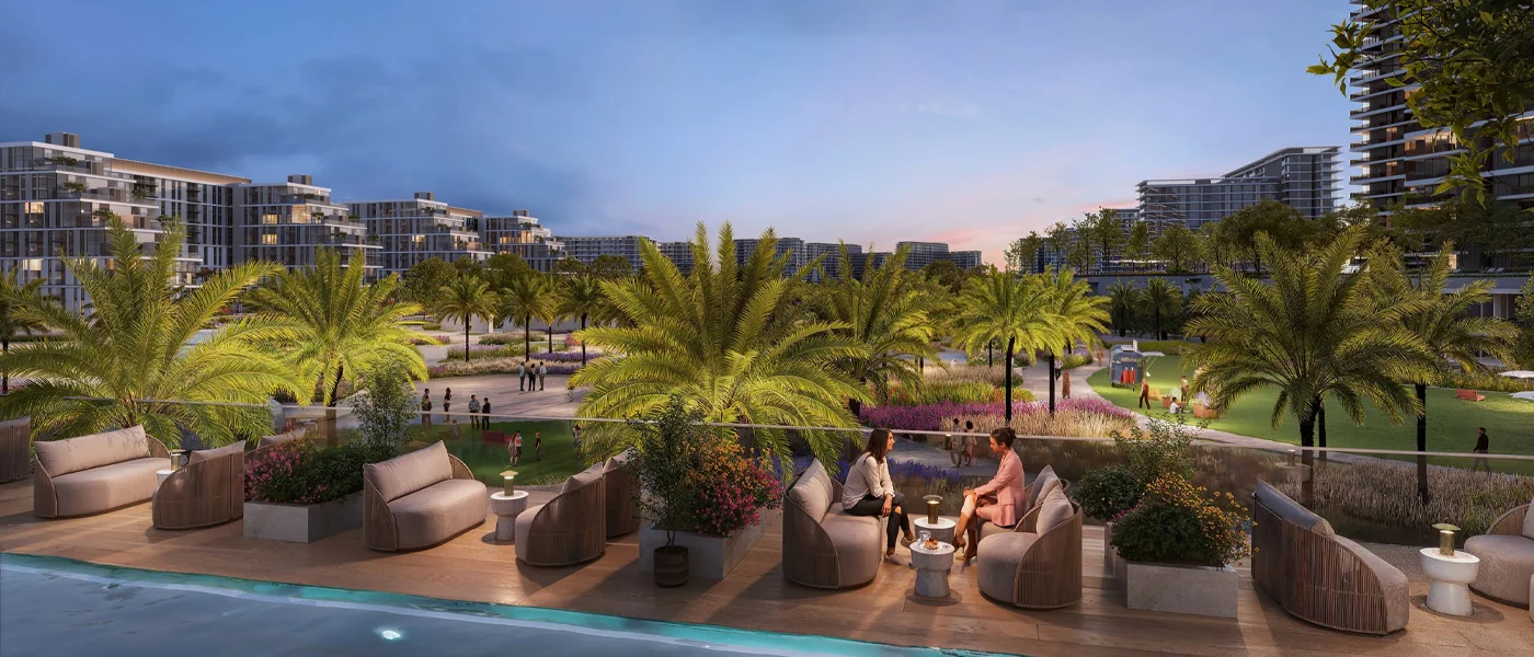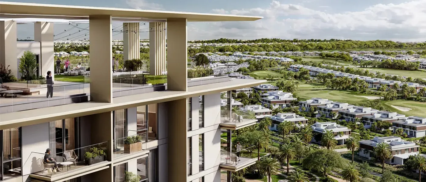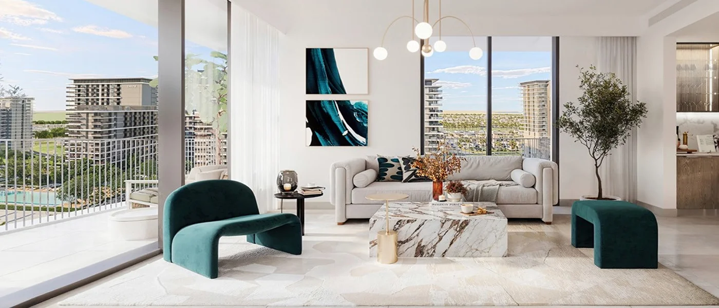 The project features thoughtfully designed apartments with open layouts, large windows, and high-quality finishes, maximizing natural light and providing stunning views of landscaped gardens and the Dubai skyline.