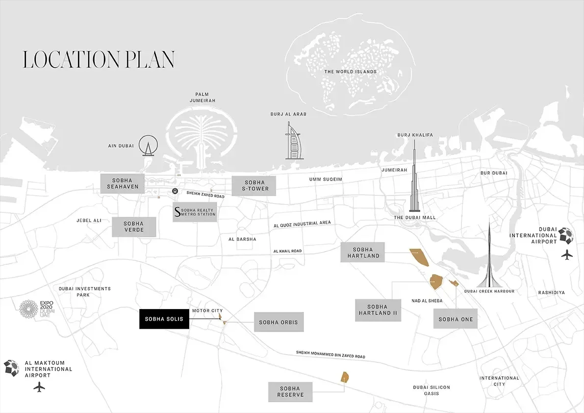 Sobha Solis is situated in the well-established Motor City community, known for its peaceful, family-friendly environment and easy access to key Dubai attractions like the Dubai Autodrome, Global Village, and Burj Al Arab. This prime location makes it a convenient and attractive place to live or invest.