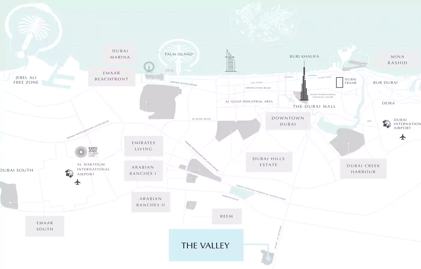 Talia is situated in The Valley, Dubai, a thoughtfully designed master community by Emaar Properties along Al Ain Road. The location provides quick connectivity to Downtown Dubai, Dubai International Airport, and other key city areas.